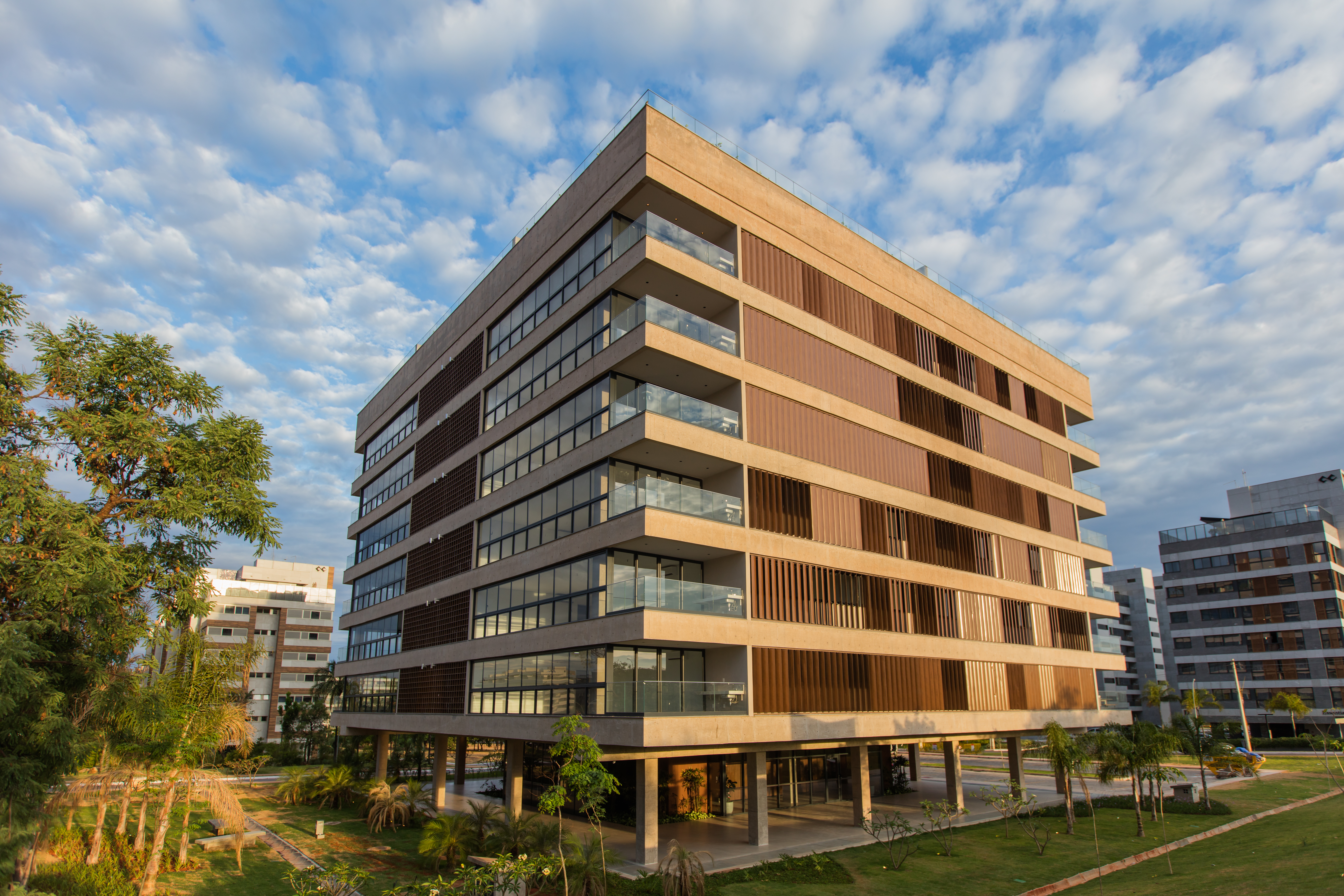 - Fachada em concreto aparente e vidro com brises fixos e pivotantes